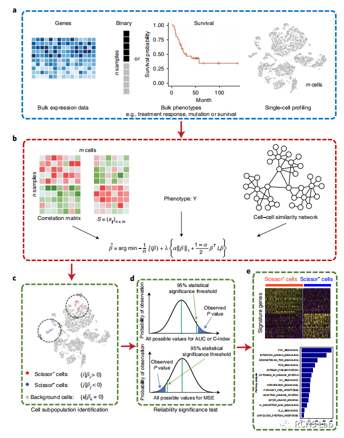 李成:本次汇报的文献为《Identifying phenotype-associated subpopulations by integrating bulk and single-cell sequencing data》单细胞RNA测序(scRNA-seq)可以区分异质组织中的细胞类型、状态和谱系。然而,当前的单细胞数据不能直接将细胞团与特定的表型联系起来。这里我们介绍Scissor,这是一种从与给定表型相关的单细胞数据中识别细胞亚群的方法。Scissor通过首先量化每个单个细胞和每个批量样本之间的相似性,整合了表型相关的批量表达数据和单细胞数据,然后在样本表型的相关矩阵上优化回归模型,以识别相关的亚群。应用于肺癌scRNA-seq数据集,Scissor确定了与较差存活率和TP53突变相关的细胞亚群。在黑色素瘤中,Scissor发现了与免疫治疗反应相关的低PDCD1/CTLA4和高Tcf7表达的T细胞亚群。除了癌症,Scissor在解释面肩肱骨肌营养不良症和阿尔茨海默病数据集方面也是有效的, Scissor通过利用表型和批量组学数据集,从单细胞分析中识别生物学和临床相关的细胞亚群。