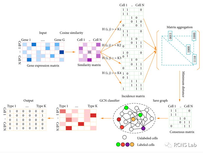 王婷:本次汇报的文献为《SCMAG: A Semisupervised Single Cell Clustering Method Based on Matrix Aggregation Graph Convolutional Neural Network》,聚类分析是单细胞数据挖掘最重要的技术之一。广泛应用于不同基因序列的划分、功能基因的鉴定、新细胞类型的检测等。传统的无监督聚类方法虽然不需要标签数据,但原始数据的分布、超参数的设置等因素都会影响聚类算法的有效性。虽然在某些情况下某些细胞的类型是已知的,但如果充分利用有关这些细胞的先验信息,则有望实现高精度。而SCMAG(一种基于矩阵聚合图卷积神经网络的半监督单细胞聚类方法),它充分考虑了单细胞数据的先验信息,有效提升了聚类精度。SCMAG的工作流程如下所示,输入是一个基因表达矩阵;该算法包括四个步骤:(1)通过余弦相似度公式计算相似度矩阵;(2)通过阈值判断关联矩阵;(3)通过矩阵聚合方法构建共识矩阵;(4)将共识矩阵保存为图;(5)最后,将图作为GCN分类器的输入进行训练。