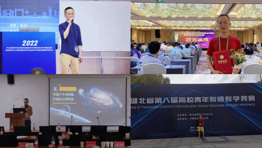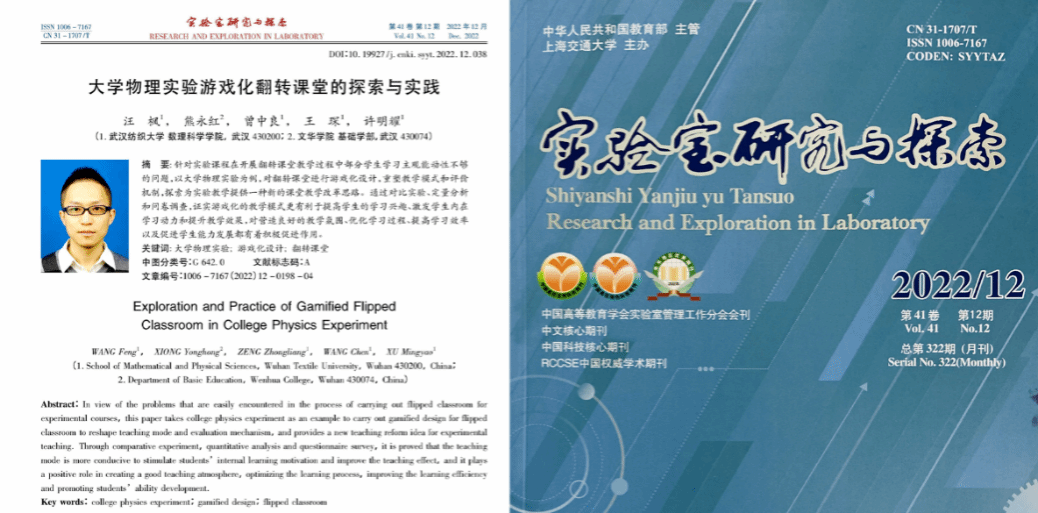2022年,汪枫老师经过多年实践和深入探究,撰写了一篇名为《大学物理实验游戏化翻转课堂的探索与实践》的教研论文,被我校认定为B1类的中文核心期刊《实验室研究与探索》所收录并发表,同年代表学校参加湖北省物理基础课程青年教师讲课比赛获特等奖,在中南赛区比赛中又获得一等奖,顺利进军全国赛,最终获得国赛三等奖,随后又参加了湖北省青教赛获三等奖。
